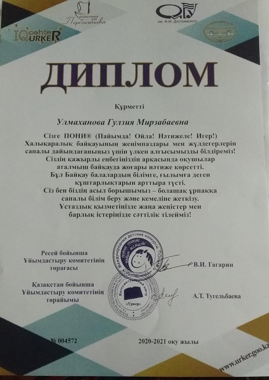 03 март 2021 0 1 2 3 4 5 Халқаралық "ПОНИ" атты байқауы Алға бастауыш мектебінің Мектепалды даярлық сыныбының оқушысы Халқаралық "ПОНИ" атты байқауына қатысып 3-дәрежелі дипломмен марапатталды. Халқаралық байқауының жүлдегерін сапалы дайындағаны үшін сынып жетекшісі дипломмен марапатталды.